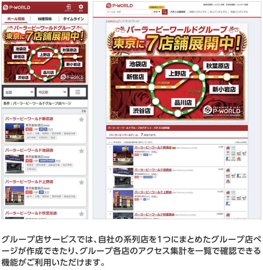 P-WORLDトップの「グループ店」より確認できる「グループ店」機能は、簡単にP-WORLD内に自社グループ店のLPを立ち上げられるため、グループ全店告知の遷移先として活用できる。YouTube動画の掲載も可能で、全店の情報を一挙公開したい時に便利な機能である。