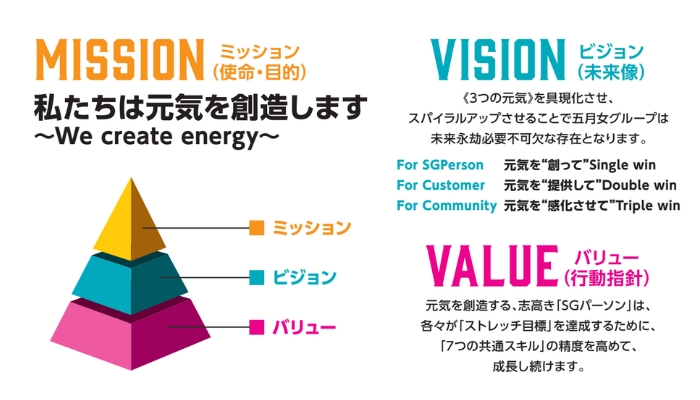 私たちの目指す企業像は明確です。企業理念のMISSION(使命・目的)に掲げている「私たちは元気を創造します~Wecreateenergy~」の実現です。全社員が元気を創り、それをお客様に提供し、そしてコミュニティ全体に感化させていく。その結果として、五月女グループが未来永劫、必要不可欠な存在であり続けることを目指しています。